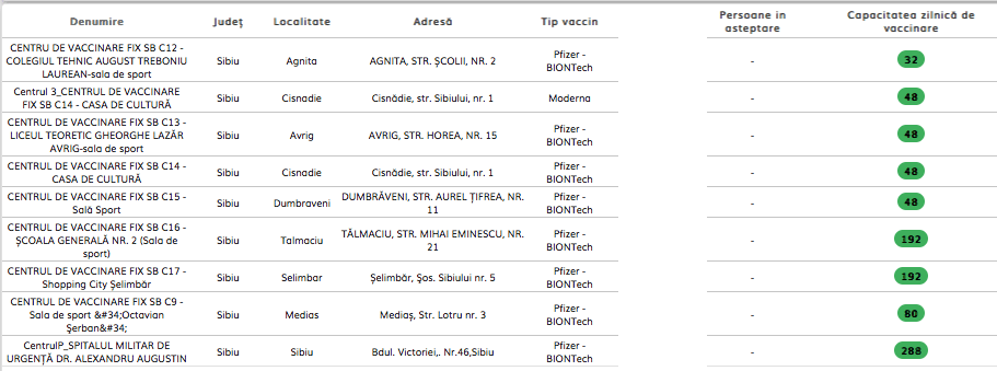 Localitățile din județul Sibiu în care cetățenii se pot vaccina sunt: Agnita, Cisnădie, Avrig, Dumbrăveni, Tălmaciu, Șelimbăr, Mediaș și Sibiu. Până în acest moment, în județul noastru au fost imunizate cu doza a III-a 427 de persoane, în integralitate cu serul produs de compania Pfizer BioNTech.