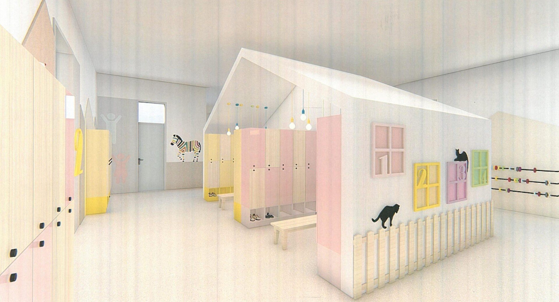 ➢ Recompartimentarea spațiilor interioare și finisaje prin care se vor crea 4 săli de grupă, o sală multifuncțională pentru servirea mesei și alte activități, grupuri sanitare, cabinetul medical, bucătăria, spălătoria, o sală pentru depozitarea cărucioarelor, spațiile administrative, vestiare și spații de depozitare.