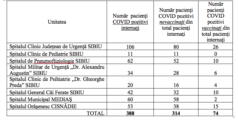 Conform ultimelor rapoarte, aproximativ 76% din cei 388 de pacienți internați în spitalele din județul Sibiu, sunt nevaccinați. Din 388 de pacienți, doar 74 de persoane s-au infectat cu COVID-19 după ce s-au vaccinat.