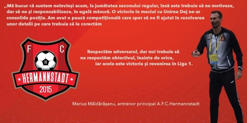 ,,Am spus asta și în trecut și o spun și acum – scopul nostru în fiecare meci este victoria! Vrem să promovăm, așa că asta trebuie să facem – să câștigăm puncte, de preferință toate cele trei puse la bătaie în fiecare meci. Mă bucur că suntem neînvinși acum, la jumătatea sezonului regular, însă asta trebuie să ne motiveze, dar să ne și responsabilizeze, în egală măsură. Suntem acum pe locul 4, însă o victorie în meciul cu Unirea Dej ne-ar duce pe locul doi și ne-ar consolida poziția sus, în clasamentul Ligii 2. Am avut o pauză competițională care sper să ne fi ajutat în rezolvarea unor detalii pe care trebuia să le corectăm. Respectăm adversarul nostru, au o echipă interesantă, cu un antrenor tânăr, talentat, au un parcurs interesant, dar noi trebuie să ne respectăm obiectivul, înainte de orice, iar acela este victoria și revenirea în Liga 1.”, a declarat Marius Măldărășanu, antrenor principal A.F.C.Hermannstadt
