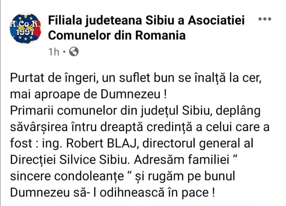 În vârstă de 62 de ani, Robert Blaj, directorul Direcției Silvice Sibiu, s-a stins din viață.
