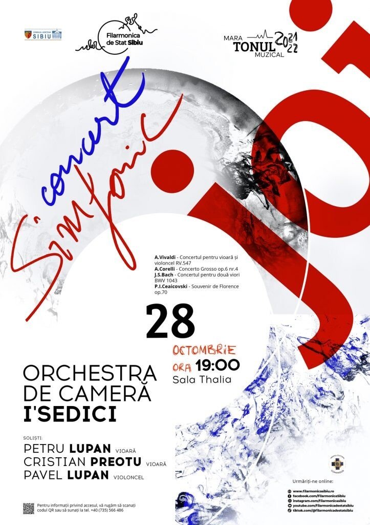 asCULTă:- A.Vivaldi – Concertul pentru vioară și violoncel RV.547 – A.Corelli – Concerto Grosso op.6 nr.4 – J.S.Bach – Concertul pentru două viori BWV 1043 – P.I.Ceaikovski – Souvenir de Florence op.70Info: https://filarmonicasibiu.ro/ro/events/concertul-orchestrei-de-camera-i-sedici