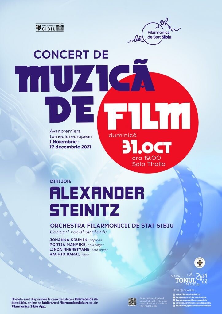 - duminică, 31 octombrie, ora 19.00, Sala Thalia – concert vocal-simfonic de muzică de film / Orchestra Filarmonicii de Stat Sibiu, soliștii Johanna Krumin – soprană, Rachid Barji – tenor, interpreții de soul Portia Manyike și Linda Rheretyane, dirijor Alexander Steinitz