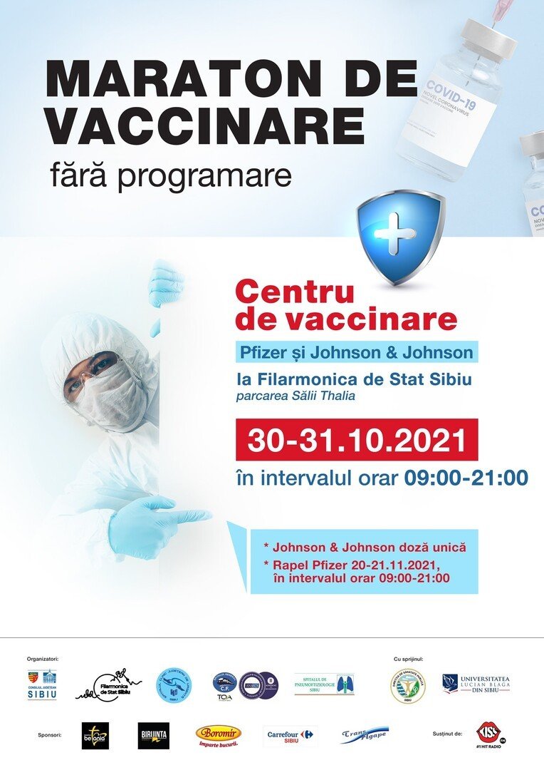 Consiliul Județean Sibiu, în parteneriat cu Filarmonica de Stat Sibiu, Spitalul Clinic Județean de Urgență Sibiu, Spitalul de Pneumoftiziologie Sibiu, Spitalul General CF Sibiu și cu sprijinul Direcției de Sănătate Publică Sibiu și al Universității „Lucian Blaga” Sibiu organizează Maratonul Vaccinării în weekend-ul 30-31 octombrie 2021, în intervalul orar 09:00-21:00, la Sala Thalia din Sibiu, cu acces din parcarea de pe bulevardul Corneliu Coposu.