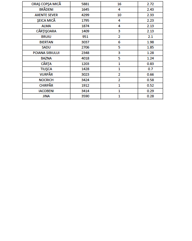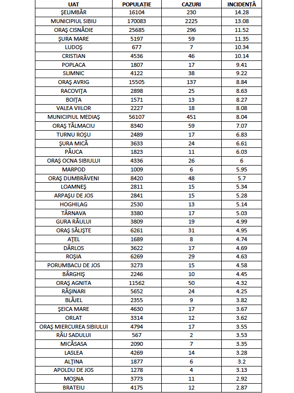 În ceea ce privește rata de incidență cumulată la nivelul județului Sibiu este de 8,81 /1000 de locuitori în ultimele 14 zile. Rata de incidență cumulată în UAT-urile din județul Sibiu este următoarea: