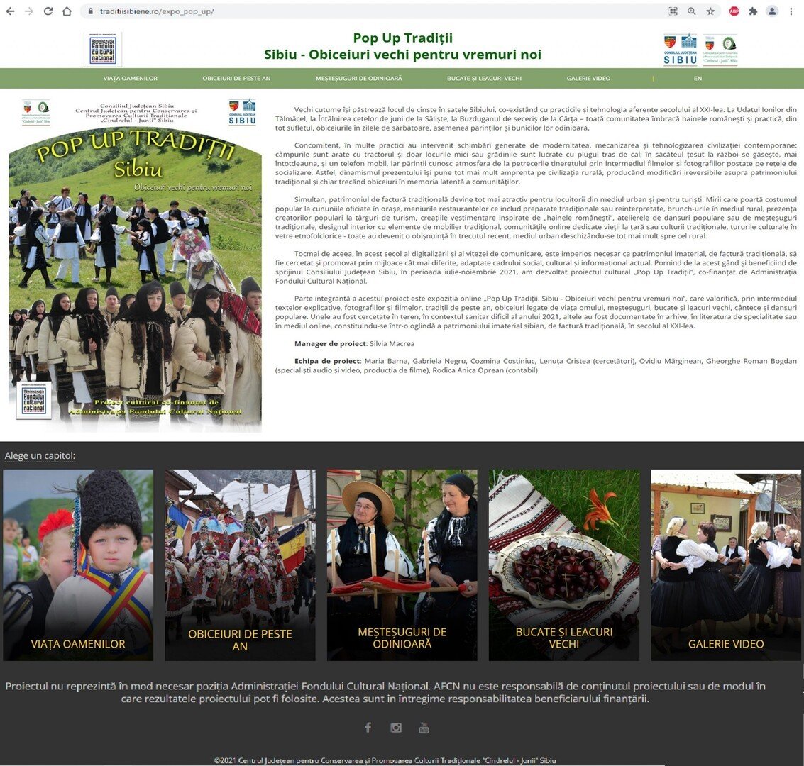 Pornind de la acest cadru socio-cultural, specialiști ai CJCPCT „Cindrelul-Junii” Sibiu au dezvoltat expoziția online „Pop Up Tradiții. Sibiu – Obiceiuri vechi pentru vremuri noi”, care valorifică obiceiuri legate de viața omului, tradiții de peste an și practici cu specific agrar, meșteșuguri de odinioară, bucate și leacuri vechi, cântece și dansuri populare. Unele au fost cercetate în teren în contextul sanitar dificil al anului 2021, altele au fost documentate în arhive, în literatura de specialitate sau în mediul online, constituindu-se într-o oglindă a patrimoniului imaterial sibian, de factură tradițională, în secolul al XXI-lea.