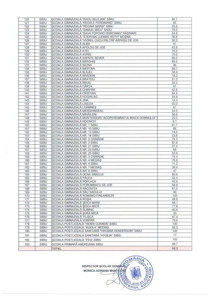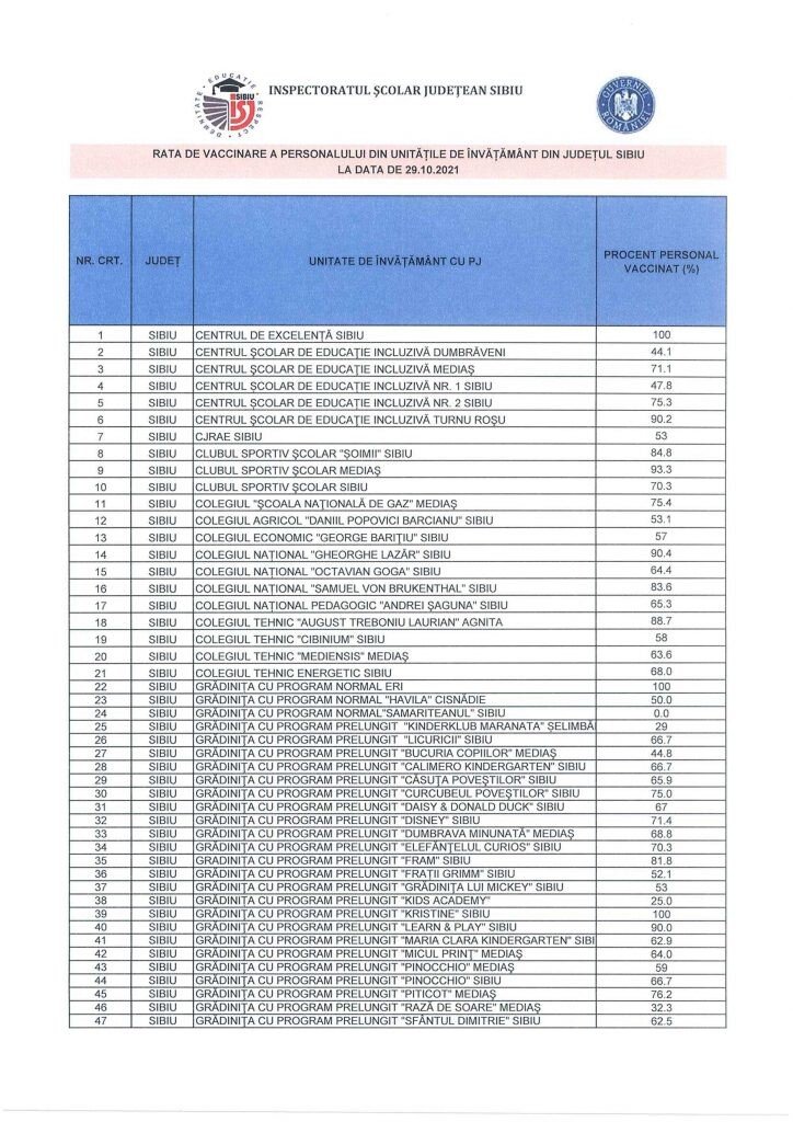 SIBIU INDEPENDENT vă prezintă lista şcolilor şi grădiniţelor din judeţul Sibiu cu situaţia vaccinării cadrelor didactice. În cele cu peste 60% cadre vaccinate se începe cursurile de luni în format fizic. În restul se vor începe orele în format online.