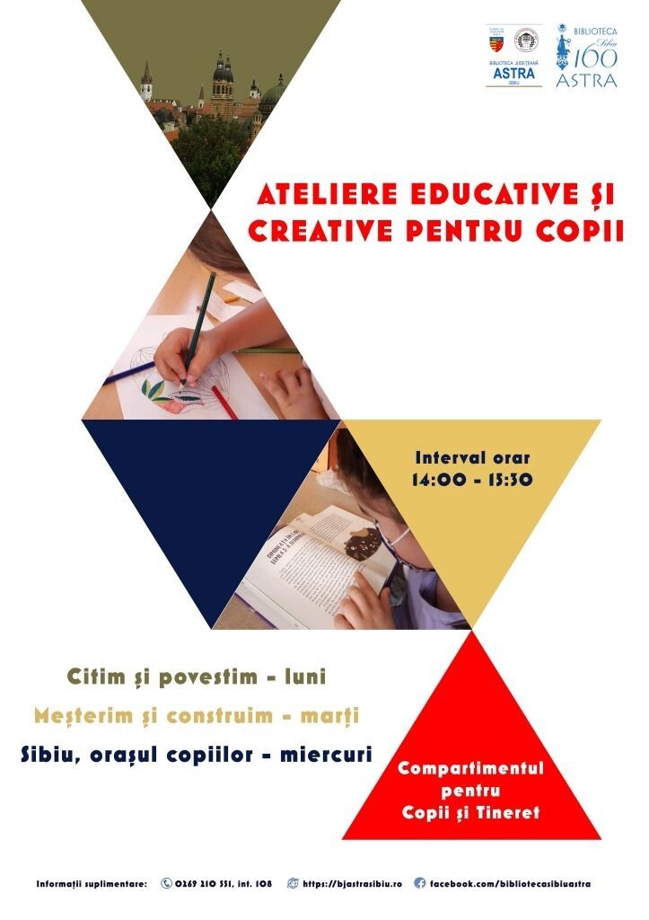 Biblioteca Județeană ASTRA Sibiu organizează, începând din 22 noiembrie 2021, o serie de ateliere dedicate elevilor sibieni din ciclul primar care doresc să participe la activități recreative după încheierea programului de la școală. Atelierele educative și creative sunt inițiate și coordonate de bibliotecarele Compartimentului pentru Copii și Tineret, Ana Coca și Paula Mihalache, și se vor desfășura de luni până miercuri, în intervalul orar 14:00 – 15:30, astfel: