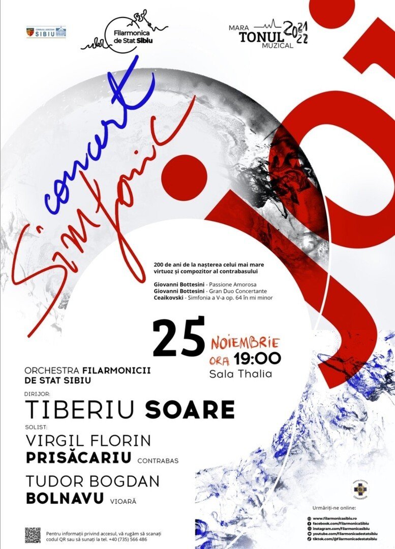 Împreună cu orchestra Filarmonicii de Stat Sibiu, sub bagheta dirijorului principal Tiberiu Soare, pe scena Sălii Thalia se vor afla soliștii Virgil Florin Prisacariu – contrabas și Tudor Bogdan Bolnavu – vioară.