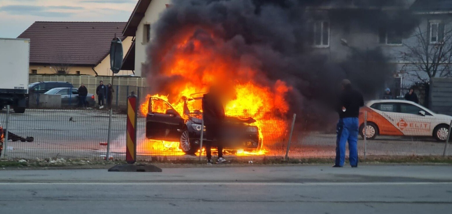 O mașină a luat foc în urmă cu puțin timp, chiar în apropierea sensului giratoriu de la intrarea în localitatea Șelimbăr.