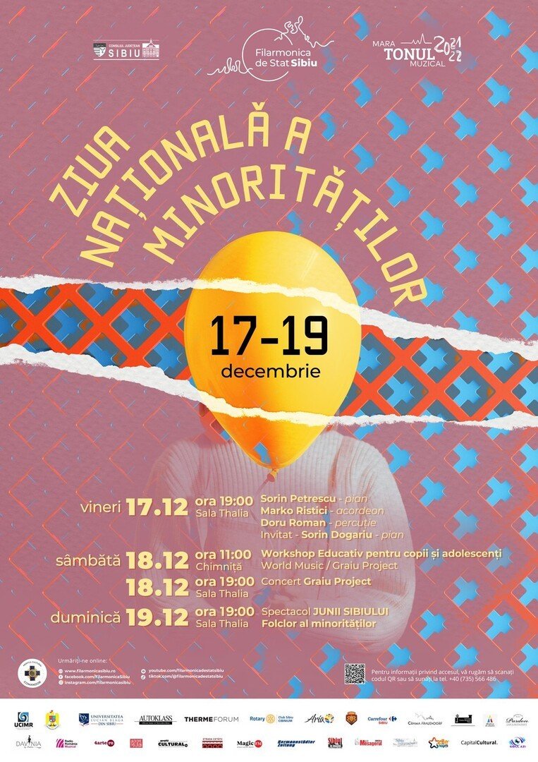 În cea de a treia zi dedicată etniilor minoritare, duminică, 19 decembrie, ora 19.00, la Sala Thalia vă așteptăm la un spectacol de muzică și dansuri tradiționale din folclorul minorităților naționale, susținut de Ansamblul Folcloric Profesionist Cindrelul – Junii Sibiului. Biletele sunt puse în vânzare la casa de bilete a Filarmonicii de Stat Sibiu și pe iabilet.ro la prețul de 40 lei (50% reducere pentru elevi, studenți, pensionari).