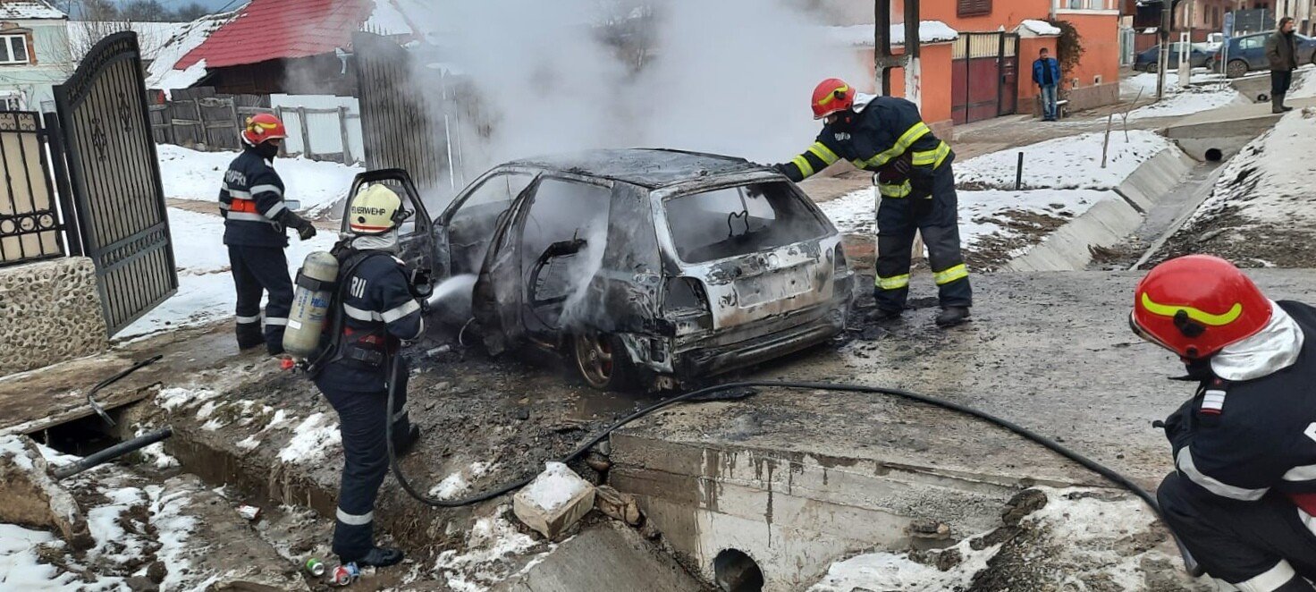 Cel de al doilea incendiu a izbucnit la un autoturism din localitatea Brădeni când proprietarul l-a pornit. La sosirea forțelor