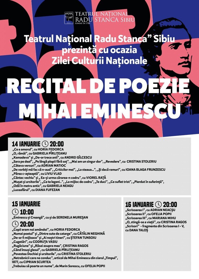 Teatrul Național „Radu Stanca” Sibiu marchează Ziua Culturii Naționale, sărbătorită în 15 ianuarie 2022, printr-o serie de recitaluri din opera poetului Mihai Eminescu și printr-un episod special Tradiții TO GO. Evenimentele vor fi transmise pe pagina de facebook a TNRS și pe canalul de YouTube în zilele de 14, 15 și 16 ianuarie 2022.