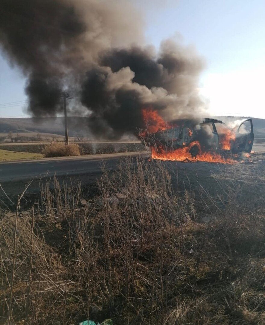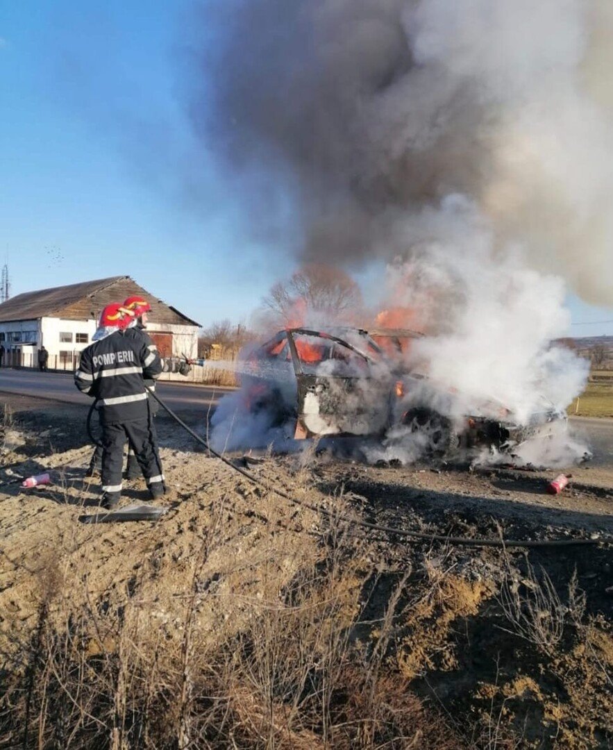 FOTO: O mașină a luat foc la Iacobeni, la ieșire spre Agnita