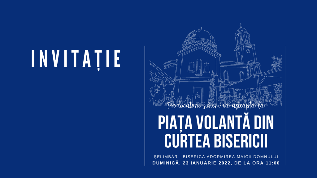 PIAȚA VOLANTĂ DIN CURTEA BISERICII – va avea loc duminică, 23 ianuarie 2022, de la ora 11:00, în curtea Bisericii Adormirea Maicii Domnului din Șelimbăr,și are ca scop sprijinirea micilor producători sibieni.