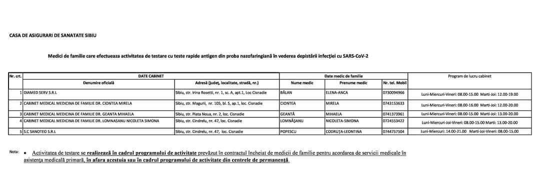 Atașat regăsiți lista medicilor de familie din Cisnădie unde se pot efectua testări rapide antigen.