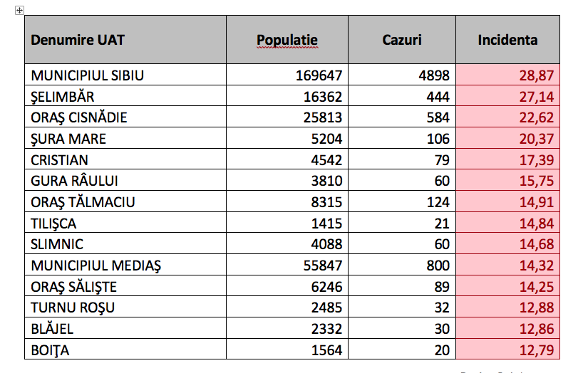 Top 5 localități cu incidența peste 17 la mia de locuitori: Municipiului Sibiu – 28,87 /, Șelimbăr – 27,14 / Cisnădie – 22,62 / Șura Mare – 20,37 / Cristian – 17,39.