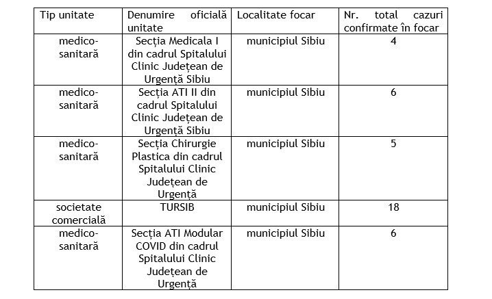Datele vin în urma centralizării DSP Sibiu, în care sunt notate patru focare existente în județul Sibiu. Conform tabelului, focarul COVID din cadrul Tursib este cel mai însemnat, cu aproape de trei ori mai multe cazuri COVID decât celelalte.