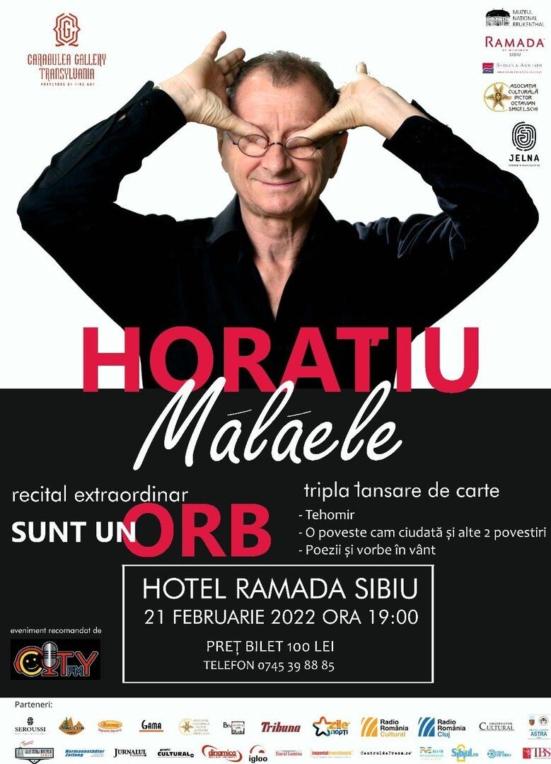 Cunoscutul actor Horațiu Mălăele vine în 21 februarie la Sibiu. După ce în luna decembrie a anului 2021 a deschis la noua galerie de artă Carabulea Gallery o impresionantă expoziție de desene, Horațiu Mălăele a ales Sibiu pentru a-și lansa ultimele volume: Tehomir, O poveste cam ciudată și alte 2 povestiri și Poezii și vorbe în vânt și pentru a susține recitalul extraordinar Sunt un orb.