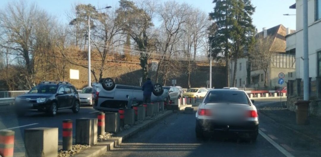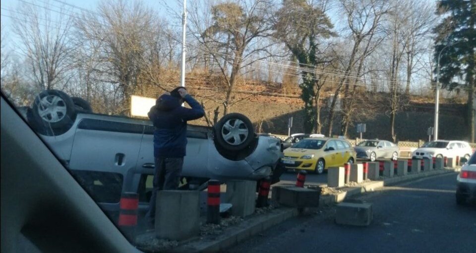 Șoferul unei mașini, în timp ce se deplasa pe Șoseaua Alba Iulia din Sibiu, a pierdut controlul direcției de deplasare și s-a răsturnat.
