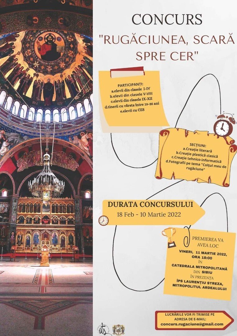 În încercarea de a redescoperi frumuseţea şi gingăşia rugăciunii, în „Anul omagial al rugăciunii în viaţa Bisericii şi a creştinului – 2022” Organizaţia Tinerilor din Sibiu şi Mitropolia Ardealului vă propun concursul „Rugăciunea, scară către cer”.
