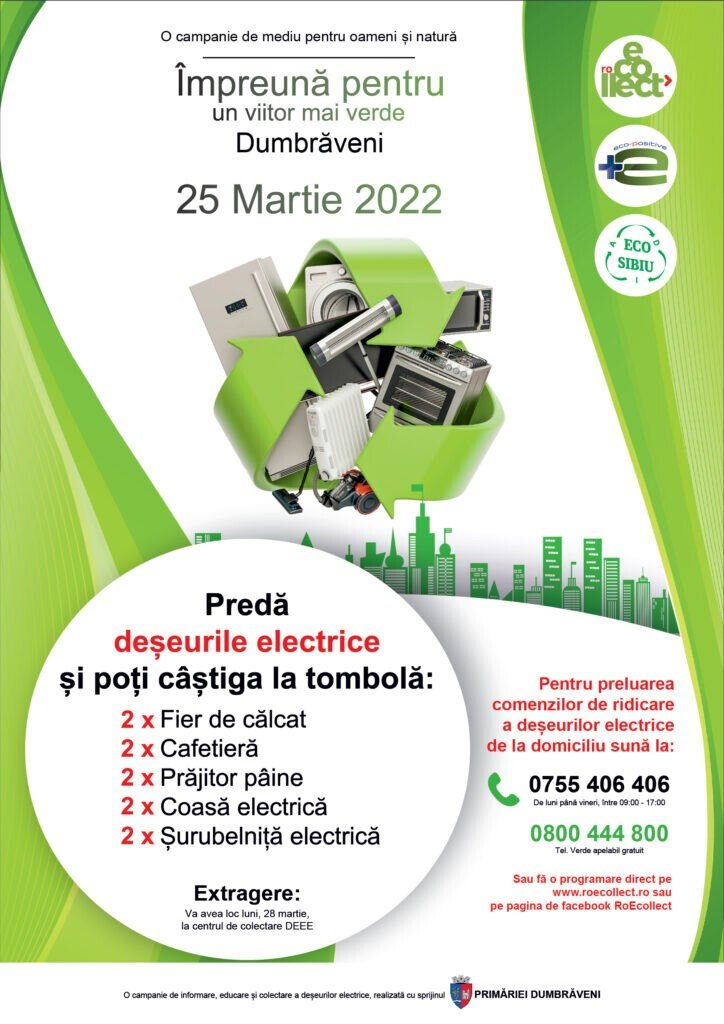 Asociaţia de Dezvoltare Intercomunitară Deșeuri Eco Sibiu și Eco Positive vor colecta deșeuri de echipamente electrice și electronice (DEEE) de la populație în Dumbrăveni în 25 martie 2022. Oamenii pot scoate echipamentele la porți și pot apela telefon 0800.444.800 (număr gratuit) sau la 0755 406 406 între orele 9-17!