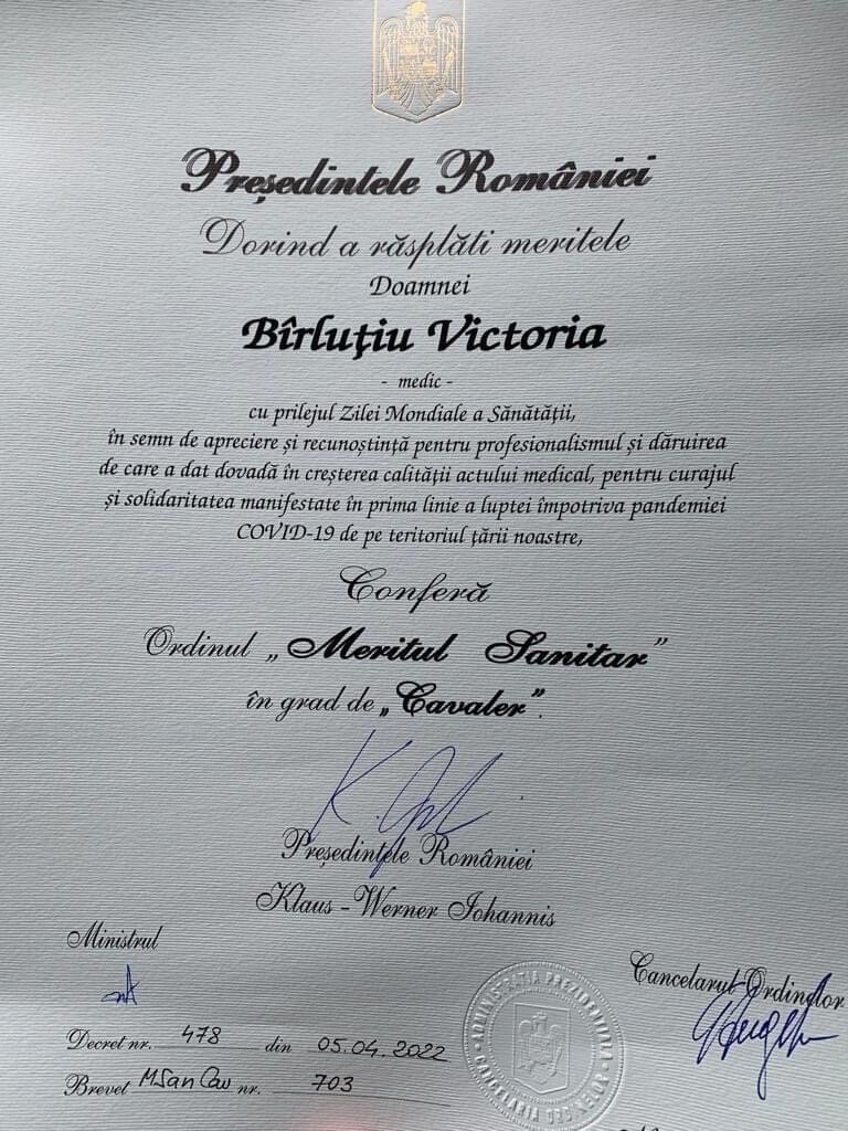 “Dacă mă întrebați cât de grei au fost ultimii doi ani, vă voi spune ca nu am avut timp sa îi analizez, au fost multe lucruri de făcut, pentru oamenii aflați în mare suferință, dar astăzi sunt copleșită de emoția momentului unic din viața unor norocoși ca mine! Ma mobilizează sa o iau mâine de la capăt!“, a declarat dna Conf. univ. dr. Victoria Birlutiu pe pagina sa de Facebook.