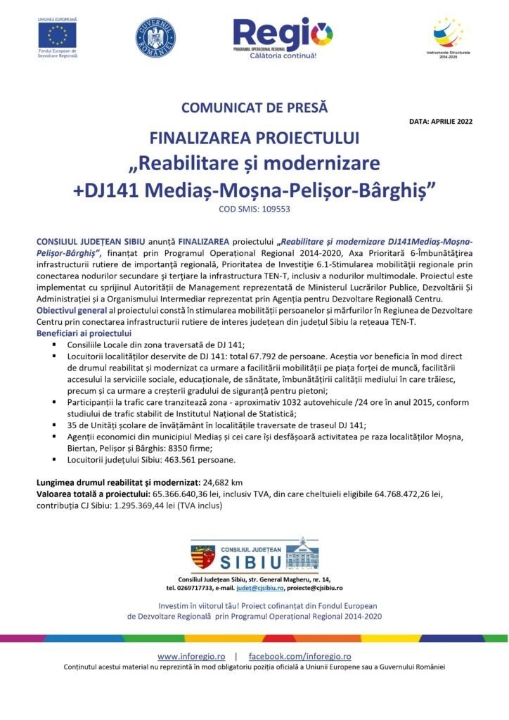 CONSILIUL JUDEȚEAN SIBIU anunță FINALIZAREA proiectului „Reabilitare și modernizare DJ141 Mediaș-Moșna-Pelișor-Bârghiș”, finanțat prin Programul Operațional Regional 2014-2020, Axa Prioritară 6-Îmbunătăţirea infrastructurii rutiere de importanţă regională, Prioritatea de Investiţie 6.1-Stimularea mobilităţii regionale prin conectarea nodurilor secundare şi terţiare la infrastructura TEN-T, inclusiv a nodurilor multimodale. Proiectul este implementat cu sprijinul Autorității de Management reprezentată de Ministerul Lucrărilor Publice, Dezvoltării Și Administrației și a Organismului Intermediar reprezentat prin Agenția pentru Dezvoltare Regională Centru.