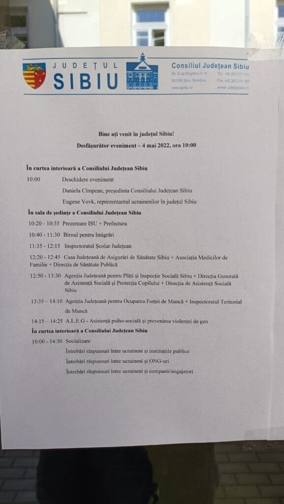 Aproximativ 200 de ucraineni au răspuns invitației Consiliului Județean Sibiu de a participa astăzi la întâlnirea cu autoritățile din județ și a afla informații de sprijin pentru ei. Daniela Cîmpean, președinta Consiliului Județean Sibiu i-a întâmpinat în curtea interioară a instituției pe ucraineni și le-a urat bun venit în județul Sibiu. Ea a transmis un mesaj de deschidere al autorităților județene alături de ONG-uri și firme către ucrainenii care au ales să se stabilească temporar la Sibiu. Întregul eveniment a beneficiat de traducere în limba ucraineană și materialele informative oferite au fost toate realizate și în limba română, dar și ucraineană.