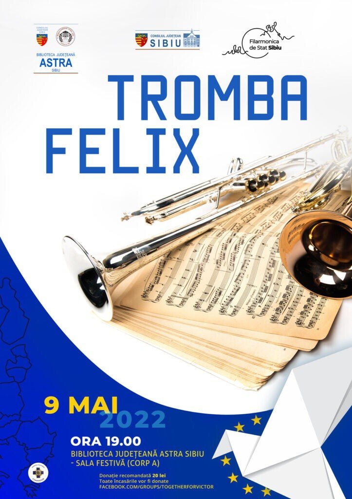 Ziua de luni, 9 mai 2022, propune publicului sibian, începând cu ora 19:00, o întâlnire cu muzica bună și lectura, în Sala Festivă a Palatului ASTRA (sediul istoric, etaj 2), în cadrul unui eveniment organizat în parteneriat cu Filarmonica de Stat Sibiu și Universitatea „Lucian Blaga” Sibiu. Programul cuprinde concertulansamblului de alamă Tromba Felix și un recital de poezie dedicat Zilei Europei. Concertul Tromba Felix cuprinde o serie de lucrări muzicale din repertoriul clasic, cât și piese din celebre filme artistice, desene animate îndrăgite, precum și piese de jazz. Publicul se va bucura de interpretarea unor compoziții clasice de la Mozart, Neruda și Ceaikovski, până la muzica din faimoasele pelicule apreciate de toate generațiile, dintre care amintim „Cartea Junglei”, „Frumoasa și Bestia”, „Cocoșatul de la Notre Dame”. Tromba Felix, unul din cele mai proaspete proiecte muzicale ale orașului Sibiu, este format din: Medve Sandor (trompetă), David Jurca-Zorlenţan (trompetă), Alin-Ştefan Roman (corn), Ion Palagniuc (trombon) şi Gheorghe Simion Ianţa (tubă). Concertul cvintetului Tromba Felix se alătură campaniei umanitare u“#TogetherforVictor”.