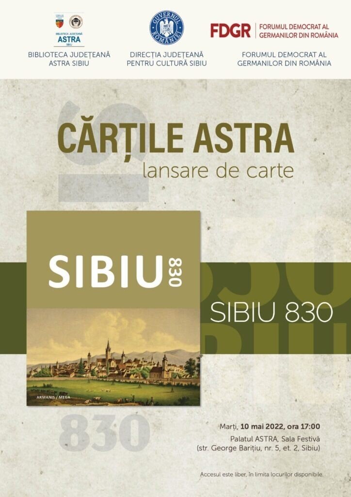 În ziua de marți, 10 mai 2022, la ora 17:00, se va da startul programului PREZENTARE DE CARTE la Biblioteca Județeană ASTRA Sibiu, o activitate care va reuni periodic numeroase evenimente dedicate cărții, scriitorilor și lecturii. Astfel, în Sala Festivă a Bibliotecii ASTRA Sibiu va avea loc lansarea cărții „SIBIU 830”(coordonatori Silviu Borș și Dan Nanu), lucrare publicată cu ocazia împlinirii a 830 de ani de la atestarea documentară a Sibiului și finanțată de către Departamentul pentru Relații Interetnice din cadrul Guvernului României, prin intermediul FDGR Sibiu. Volumul cuprinde articole și imagini privind aniversarea sau comemorarea unor personalități și evenimente care au influențat istoria și dezvoltarea orașului Sibiu.