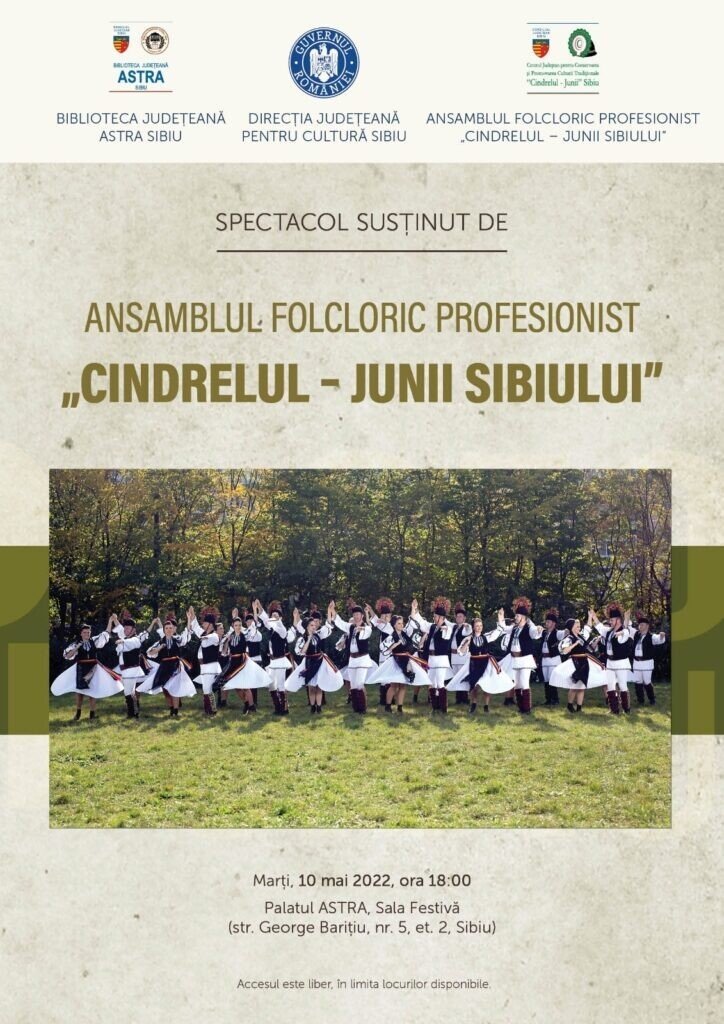 Manifestările culturale dedicate Zilei Europei continuă marți, de la ora 18:00, pe scena Sălii Festive, cu spectacolul „Ăsta-i jocul Junilor”, susținut deAnsamblul Folcloric Profesionist „Cindrelul – Junii Sibiului”, cea mai veche formație de dansuri populare din România. Spectatorii vor avea prilejul de a se bucura de momente pline de ritm, muzică și culoare. Programul cuprinde dansuri populare, piese instrumentale și vocale din subzonele folclorice ale Sibiului, precum și momente muzical-coregrafice, care valorifică patrimoniul cultural specific etnicilor germani și maghiari. Împreună, soliștii vocali Alina Bîcă și Robert Târnăveanu, dansatorii și instrumentiștii Ansamblului „Cindrelul-Junii Sibiului” vor reprezenta frumusețea și bogăția Sibiului cultural și aportul acestuia la patrimoniul european. Coregrafia spectacolului este semnată de Silvia Macrea, manager și Alesea Sas, asistent coregrafie, iar conducerea muzicală este asigurată de Gabriel Popescu.