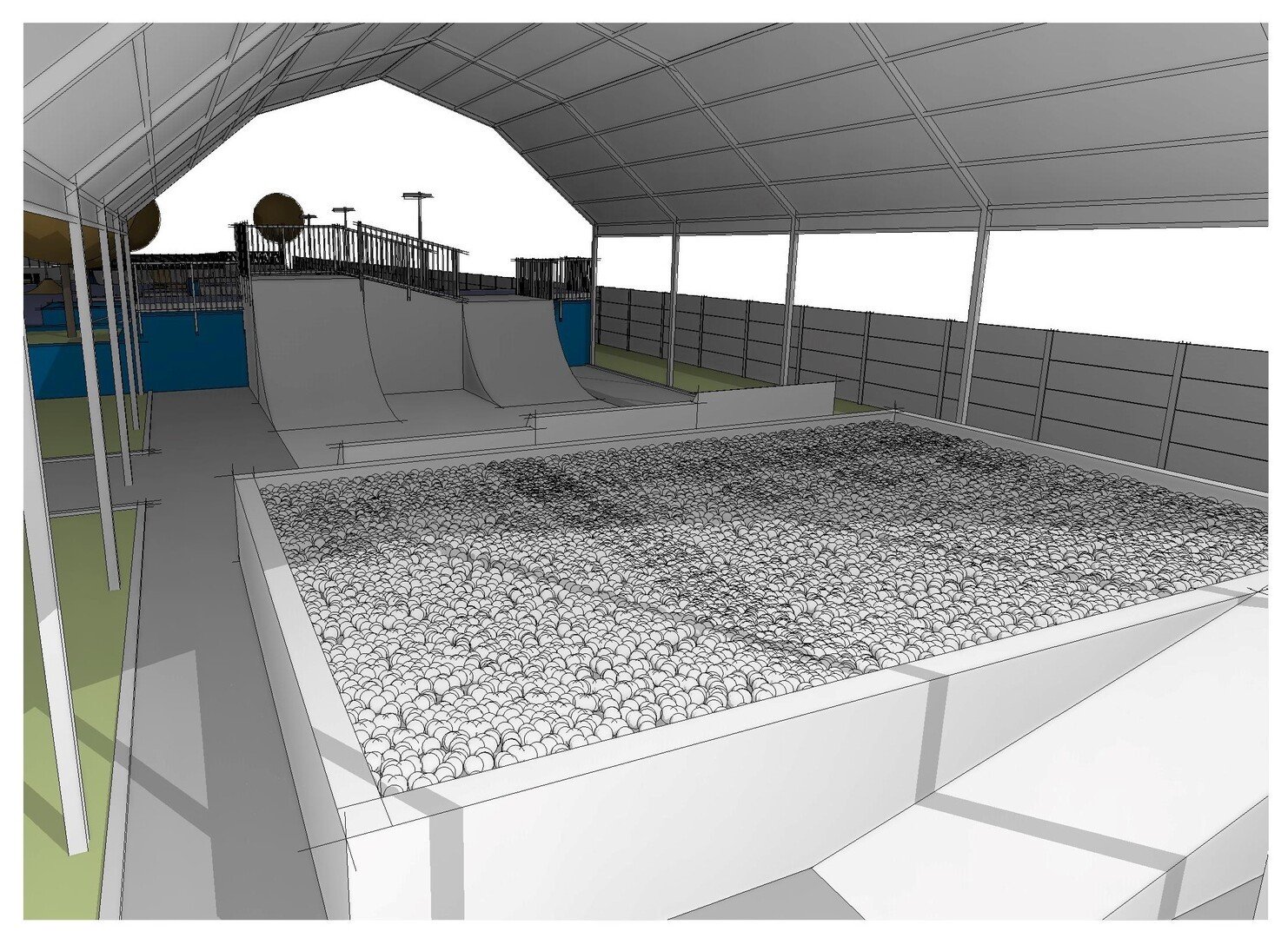 Constructorul, firma Sport Play Systems SRL, va amenaja foampit-ul pe o suprafață de 250 mp, constând într-o cuvă ai cărei pereți vor fi căptușiți cu burete gros, precum și într-o serie de rampe pentru lansarea sportivilor spre cuvă. Pentru a o feri de intemperii, instalația va fi protejată cu o copertină metalică. În această primă etapă s-au început săpăturile pentru cuvă și amenajarea instalațiilor de apă și curent.