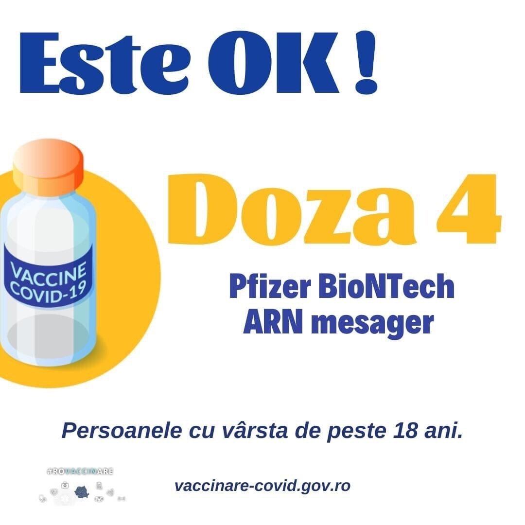 Pot solicita vaccinarea cu doza a 4-a persoanele peste 18 ani care au fost vaccinate împotriva COVID-19 cu 3 doze de vaccin de tip ARN mesager.