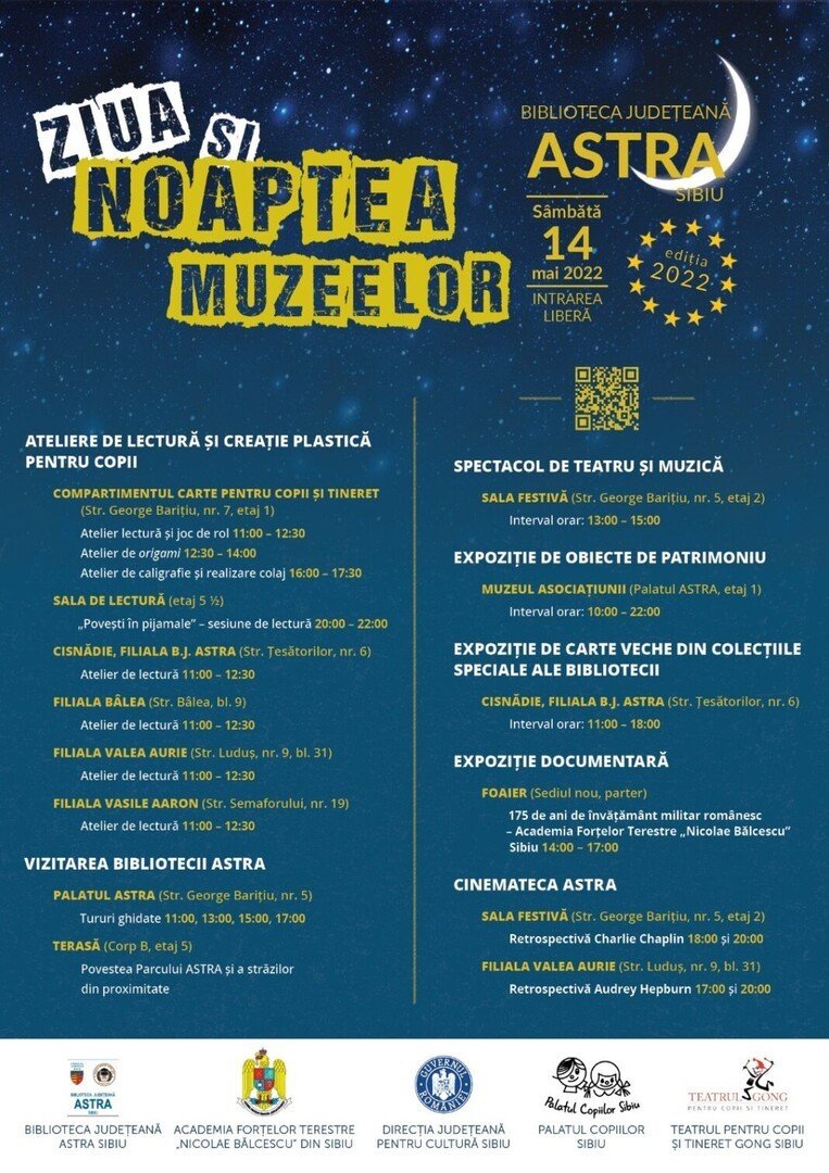 Sâmbătă, 14 mai 2022, Biblioteca Județeană ASTRA Sibiu, ale cărei acțiuni sunt posibile cu finanțare din partea Consiliului Județean Sibiu, se alătură instituțiilor muzeale, sărbătorind Ziua și Noaptea Muzeelor 2022, eveniment care susține și promovează patrimoniul local și național, cultura și educația. Cei care își vor îndrepta pașii spre biblioteca publică sibiană vor avea ocazia să viziteze spații ale bibliotecii și, în egală măsură, să ia parte la o serie de activități și evenimente culturale pregătite de echipa bibliotecarilor astriști.