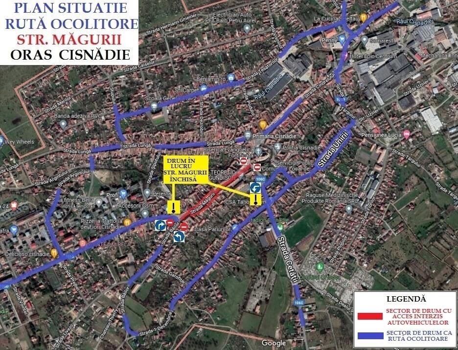 Pentru siguranța participanților la traficul rutier pe sectorul cuprins între intersecția cu str. Cetății până la intersecția cu str. Băilor, circulația autoturismelor va fi deviată pe o rută ocolitoare după cum urmează: