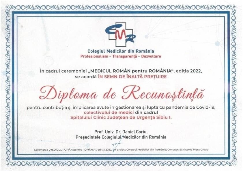 Spitalului Clinic Județean de Urgență Sibiu a primit „Diploma de Recunoștință” pentru contribuția și implicarea avută în gestionarea și lupta cu pandemia de Covid -19, în cadrul ceremoniei „MEDICUL ROMÂN pentru ROMÂNIA. Colegiul Medicilor din România.