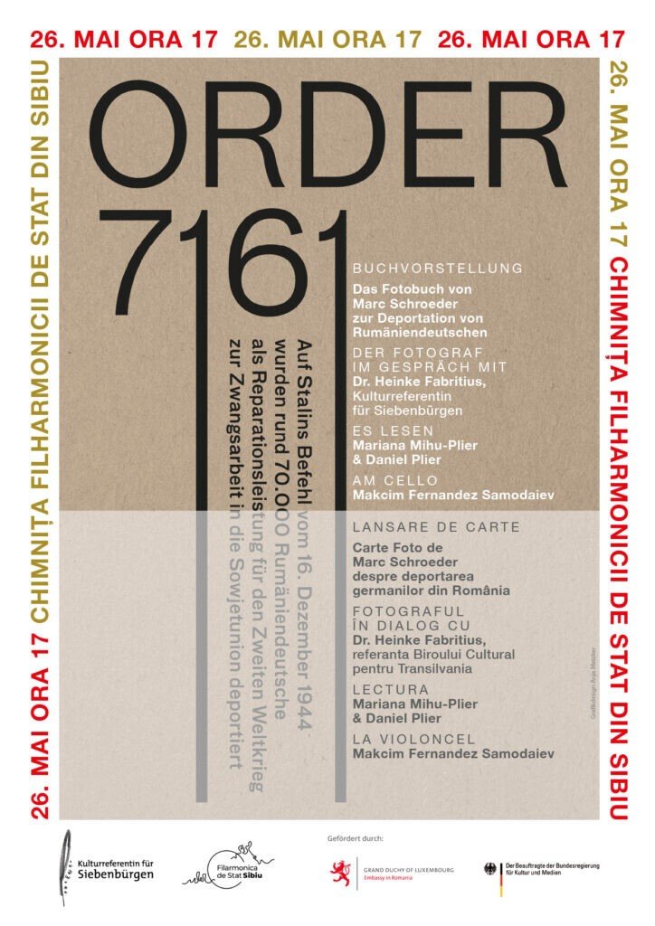 Marc Schroeder a stârnit interesul cu un proiect fotografic intitulat „Order 7161”, care în ultimii ani a putut fi văzut în mai multe expoziții atât în România, cât și în Germania. Portretele realizate între anii 2012 și 2015 cu 40 de foști deportați, martori ai unor vremuri extrem de dificile, reamintesc de un episod aproape uitat din istoria Europei postbelice.