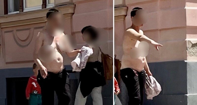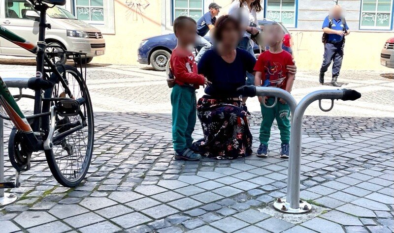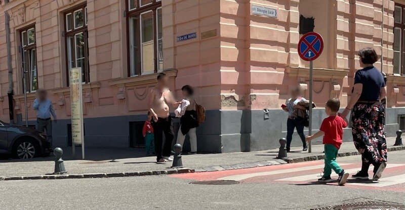 Cei prezenți astăzi în Piața Mare din Sibiu au avut parte de o experiență mai puțin plăcută. O mamă cu doi copii, pe jumătate dezbrăcată, și-a făcut remarcată prezența.