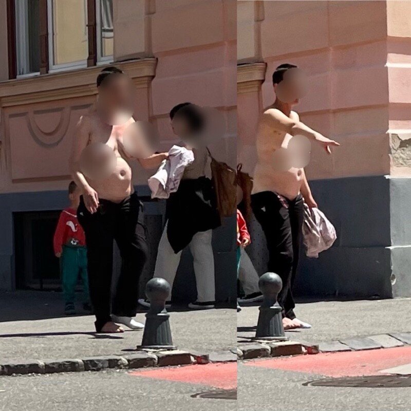 Aceasta a tranzitat prin Piața Mare din Sibiu, în sânii goi, zbierând și amenințând în stânga și în dreapta. Oamenii prezenți la terase sau la plimbare au sunat speriați la 112.