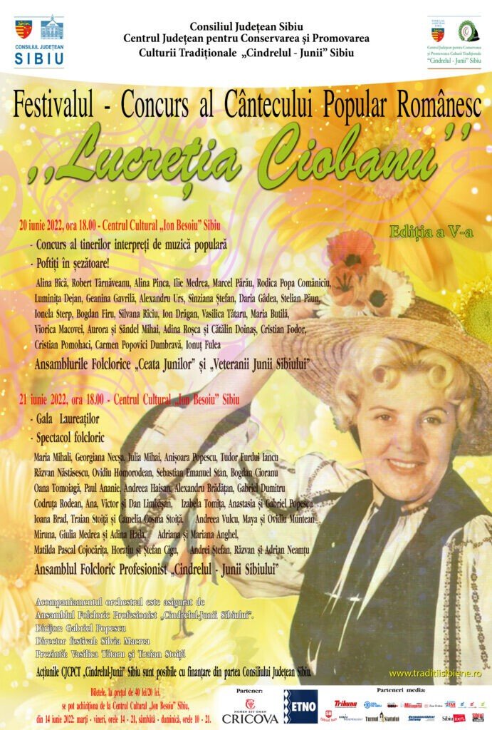 Consiliul Judeţean Sibiu şi Centrul Judeţean pentru Conservarea şi Promovarea Culturii Tradiţionale „Cindrelul – Junii” Sibiu sunt organizatorii celei de-a V-a ediții a Festivalului-Concurs al Cântecului Popular Românesc„Lucreția Ciobanu”; spectacolele se desfășoară în 20 și 21 iunie a.c., ora 18, la Centrul Cultural „Ion Besoiu” din Sibiu.