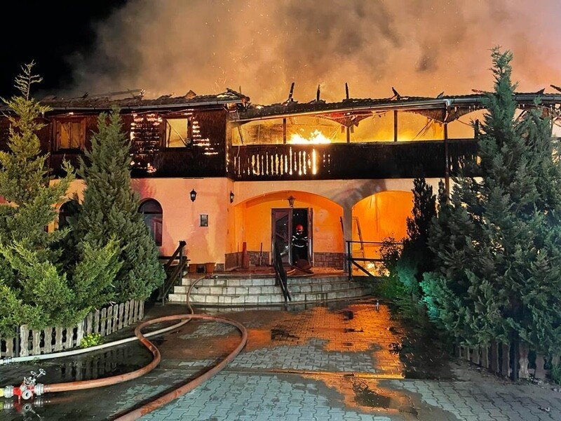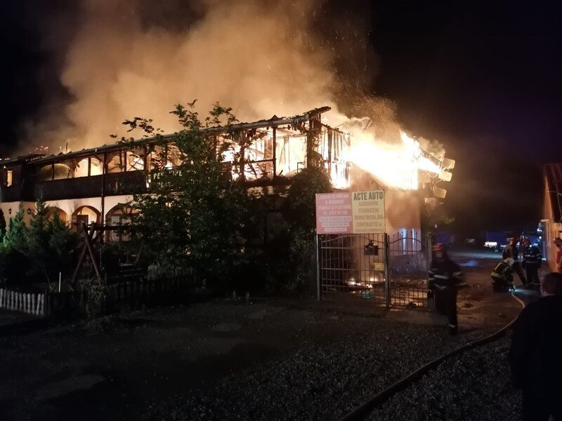 „În cursul nopții, în jurul orei 02:52, pompierii militari din cadrul ISU Sibiu au intervenit de urgență cu trei autospeciale de stingere cu apă și spumă, o autoscară și un echipaj SMURD, pentru localizarea și lichidarea unui incendiu la o unitate de cazare turistică din Tălmaciu. La fața locului incendiul se manifesta generalizat la acoperiș și etajul superior. Pompierii militari au fost sprijiniți în misiunea lor de membri SVSU Tălmaciu. În urma scurtcircuitului electric care a cauzat incendiul, a ars în totalitate construcția de tip p+e, având o suprafață de aproximativ 500 mp. De asemenea, la fața locului echipajul SMURD a acordat îngrijiri medicale proprietarei, care a suferit un atac de panică, aceasta refuzând să fie transportată la spital.” a declarat Sg. maj. Andreea Ștefan