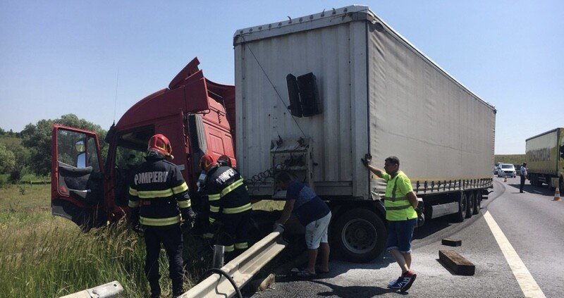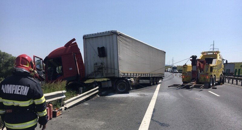 Autoaccident urmat de incendiu. Un autocamion a ieșit în decor pe A1