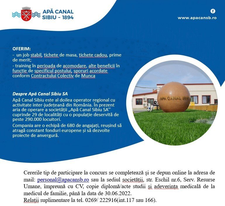 Cererile tip de participare la concurs se completează și se depun online la adresa de mail personal@apacansb.ro sau la sediul societăţii, str. Eschil nr.6, Serv.Resurse Umane, împreună cu CV, copie diplomă studii şi adeverinţa medicală de la medicul de familie, până la data de 30.06.2022. Relaţii suplimentare la tel. 0269/ 222916(int.117 sau 166).