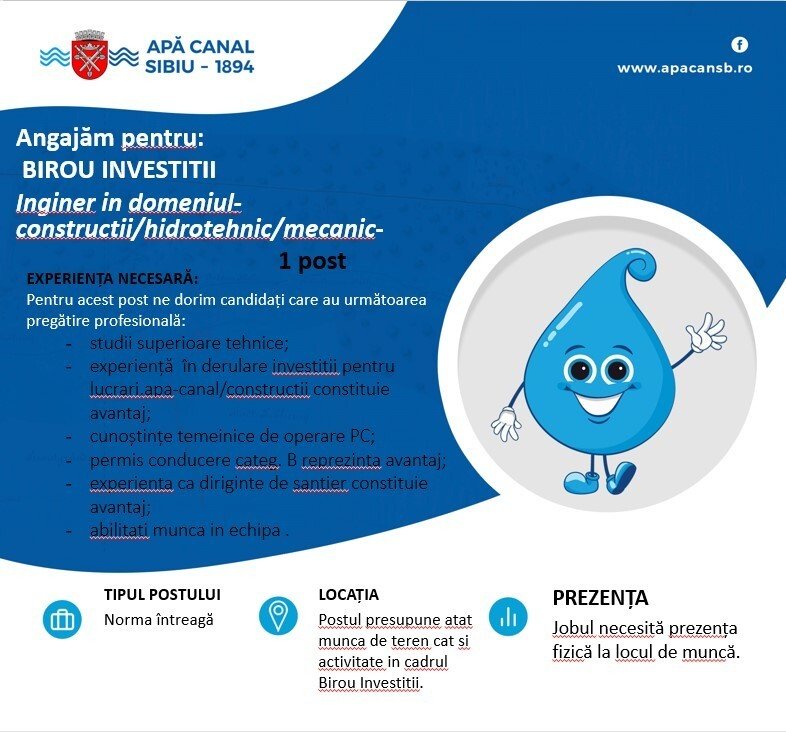 APĂ CANAL SIBIU S.A. angajează pentru :