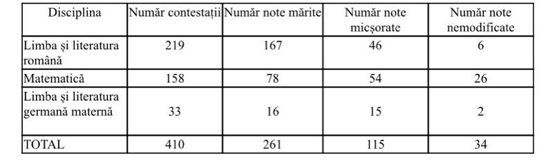 Menționăm că numărul total de contestații depuse a fost de 410 (față de 404 raportate săptămâna trecută), deoarece 6 contestații depuse on-line au fost depistate în zona de „spam”. Acestea au fost identificate în timp util, astfel încât toți elevii care au depus contestații au avut lucrările reevaluate.