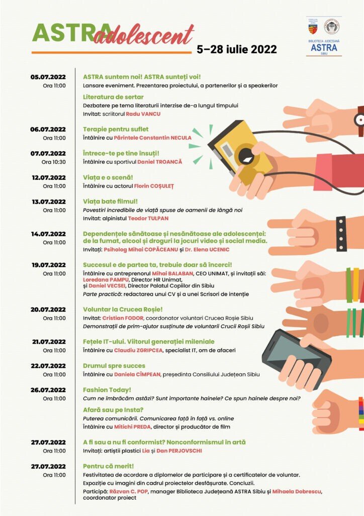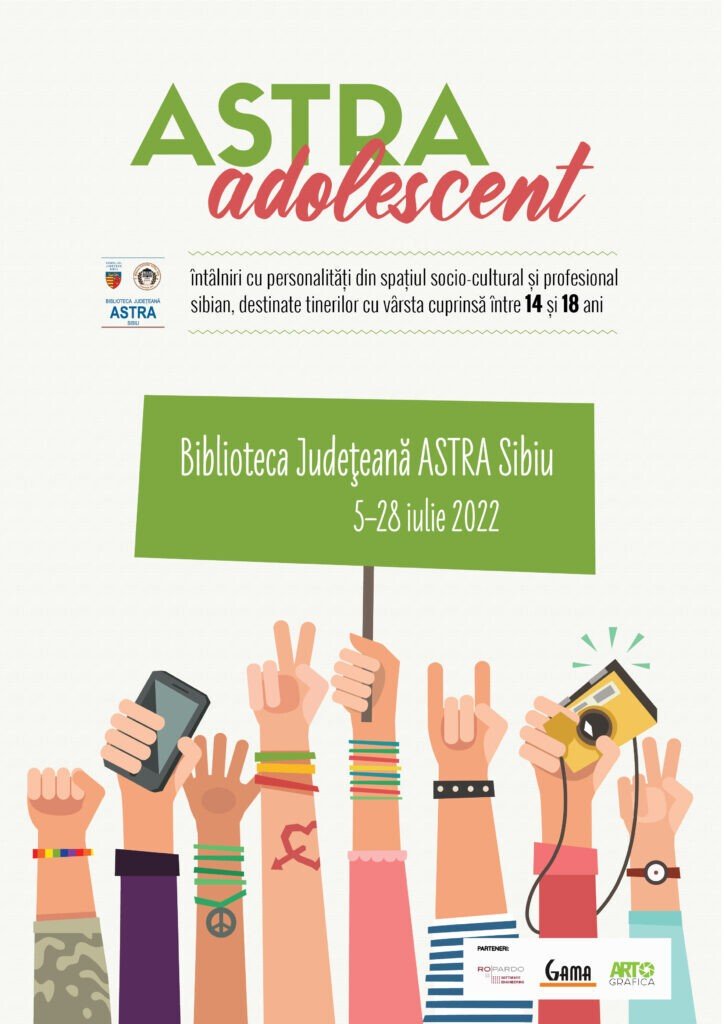 Pe parcursul lunii iulie a.c., adolescenții sibieni sunt așteptați la biblioteca publică județeană pentru a participa la o serie de întâlniri cu personalități ale spațiului socio-cultural și profesional sibian. Dedicat în special tinerilor cu vârste cuprinse între 14 și 18 ani, programul ASTRA Adolescent oferă acestora prilejul de a interacționa, într-un cadru informal și relaxat, cu specialiști din domenii care vizează științele sociale, medicina, educația civică, psihologia, literatura etc. Biblioteca Județeană ASTRA Sibiu, instituție ale cărei acțiuni sunt posibile cu susținerea financiară a Consiliului Județean Sibiu, vine în întâmpinarea nevoilor publicului tânăr, oferind o gamă largă de activități. În egală măsură, tinerii vor fi implicați în realizarea activităților și în pregătirea dezbaterilor cu invitații. Echipa bibliotecarilor astriști va aduce în fața participanților o serie de profesioniști din diverse domenii care, printr-un dialog susținut, vor aborda teme de interes general, subiecte mai puțin dezbătute în familie sau societate și probleme legate de viața cotidiană a adolescenților.