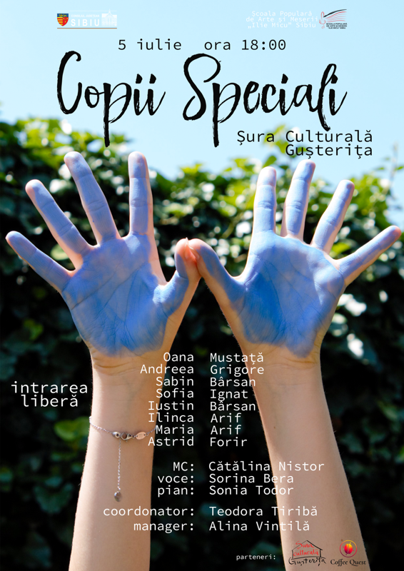 Consiliul Județean Sibiu, prin Școala Populară de Arte și Meserii „Ilie Micu” Sibiu, în parteneriat cu Șura Culturală Gușterița, organizează marți, 5 iulie 2022, începând cu ora 18:00, piesa de teatru „Copii Speciali”, un spectacol interactiv pus în scenă de elevii cu vârste cuprinse între 10 și 11 ani ai clasei de actorie coordonată de Teodora Tiribă. Teodora este regizor de teatru, absolventă UNATC București la clasa Liudmilei Szekely Anton.