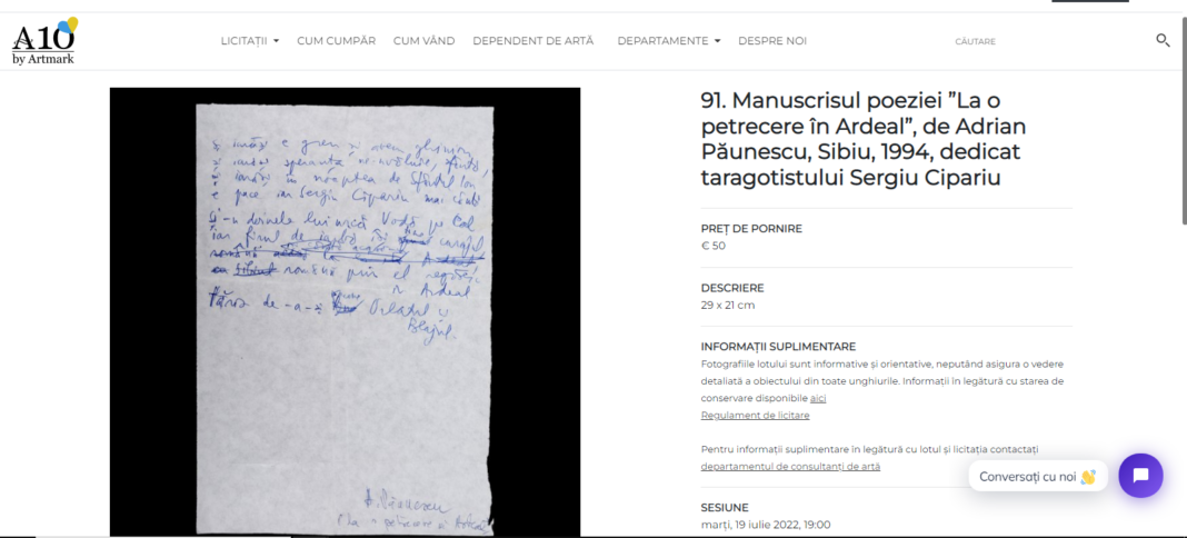 Licitaţia pentru manuscris se va desfăşura în 19 iulie la ora 19 la Bucureşti, dar se primesc oferte şi online şi prin telefon. Preţul de pornire pentru acest manuscris este de 50 de euro.