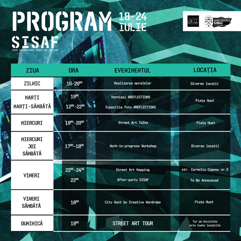 Sibiu International Street ART Festival este un eveniment organizat de Asociația ART Factory Transilvania și cofinanțat de Primăria Municipiului Sibiu.